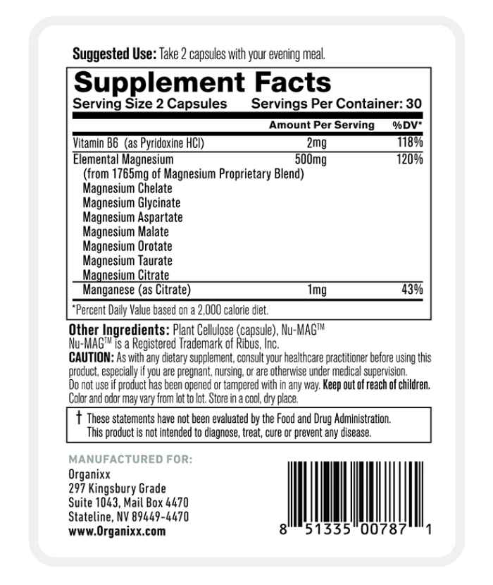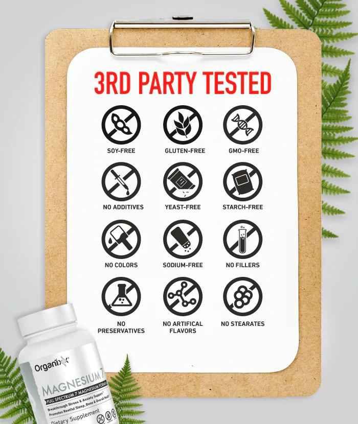 - No magnesium oxide, chloride, hydroxide, sulfate, or stearate